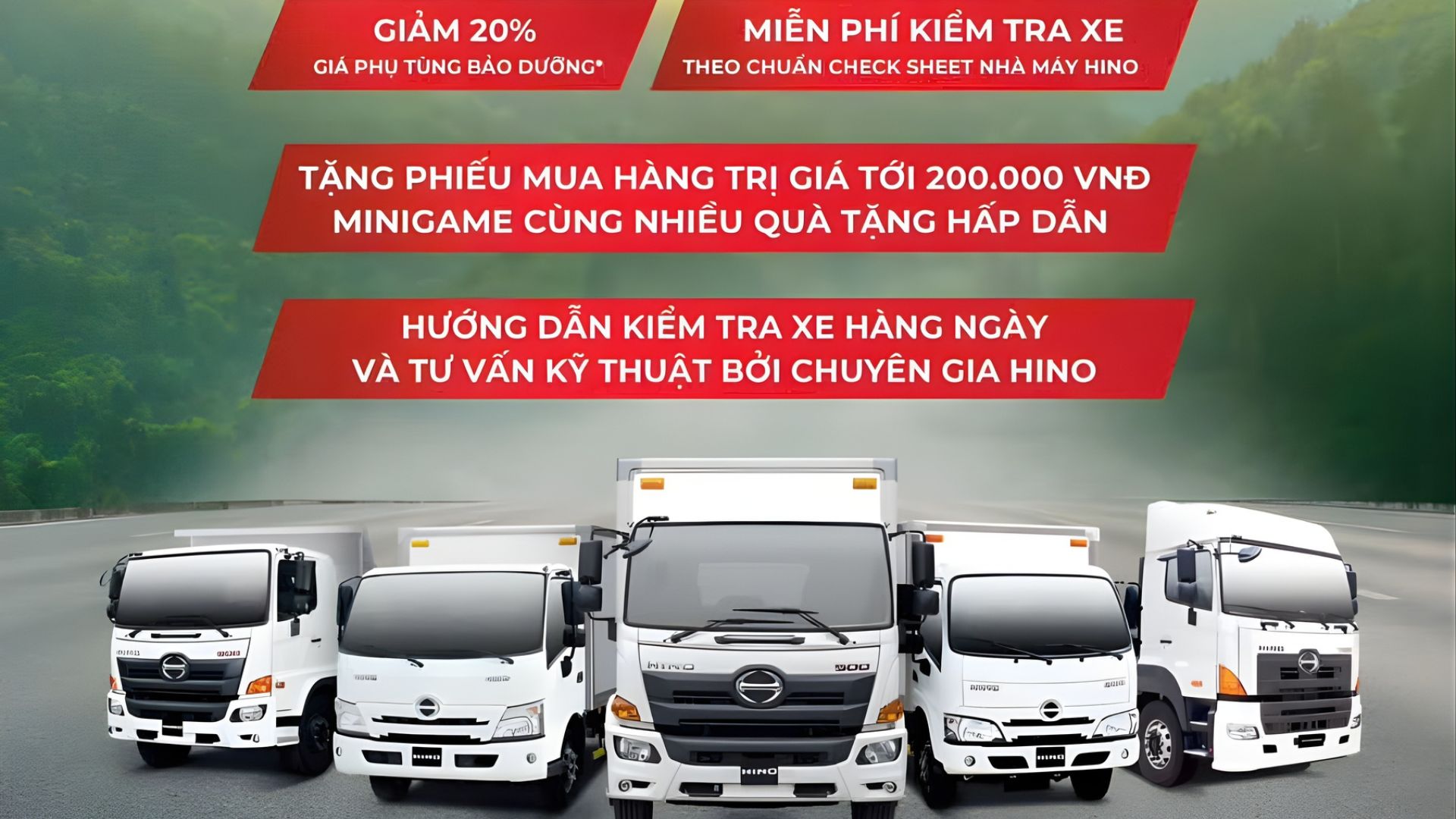 • Miễn phí 100%: Công kiểm tra xe toàn diện theo tiêu chuẩn Hino Nhật Bản.